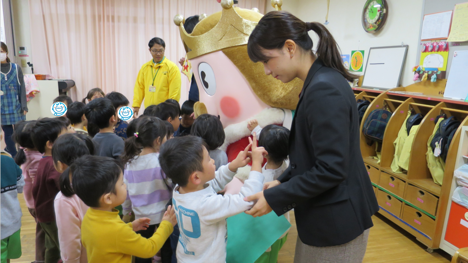 2018年12月 豪雨で被害を受けた真備町の保育園をおもちゃ王国キャラクターの「シーゲルンⅠ世」と一緒に訪問しました。